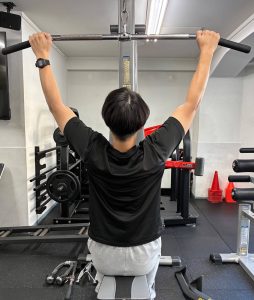 ラットプルダウンでは、広背筋の活動により肩甲骨が下制方向へ引かれ、肩甲帯の過度な挙上が抑れるため、首肩部の筋緊張を軽減する効果が期待できます。